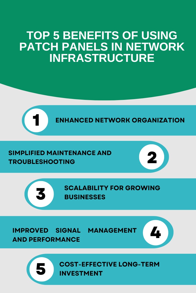 Another significant advantage of using Patch Panels is their role in maintaining signal integrity. By providing stable and reliable terminations for each cable, Patch Panels reduce the risk of interference, cross-talk, or signal loss---especially important in high-speed networks.